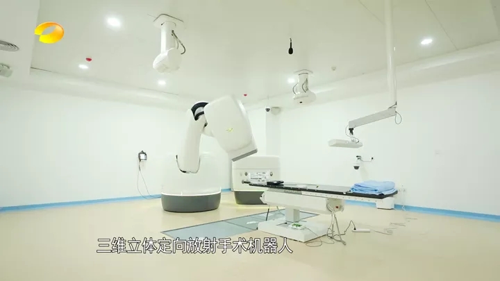 节目中介绍到的“三维立体定向放射手术机器人”,是我院国际肿瘤医疗中心引进的目前国内首台"全数字化安科锐M6立体定向放射外科机器人",它属于立体定向放射治疗(SBRT)的范畴,能够从三维立体的方向追踪病人体位、肿瘤位置和病人呼吸运动的反馈,并能在治疗过程中针对病人的肿瘤靶区(治疗的目标如肿瘤等)因呼吸运动而产生的微小移动的动态状态下通过医学影像的引导进行照射方向的实时修正。射波刀可治疗全身各部位的肿瘤,只需3~5次的照射,即可杀死肿瘤组织,是唯一综合“无伤口、无痛苦、无流血、无麻醉、恢复期短”五大优势于一身的智慧精准放疗利器,有着“卓越的肿瘤杀手”之称。